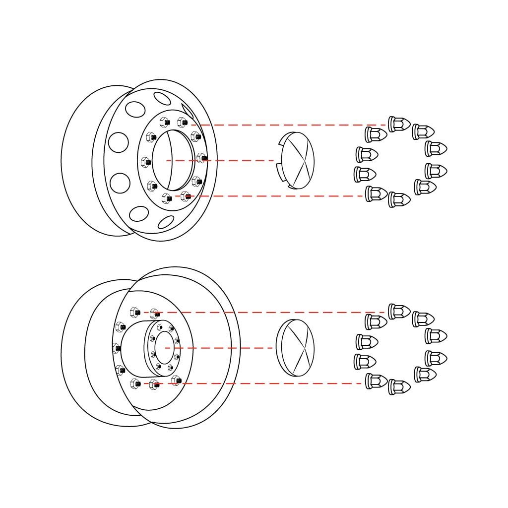 What’s Included: 2 x Chrome Metal 6 Uneven Notch Front Hubcaps with a 7/16” Lip (Fits 6|4 x Chrome Metal 8” Inner Diameter Rear Hubcaps with a 1” Lip|5 & 4 Notches)|60 x Chrome ABS Plastic 33mm Push On Nut Covers